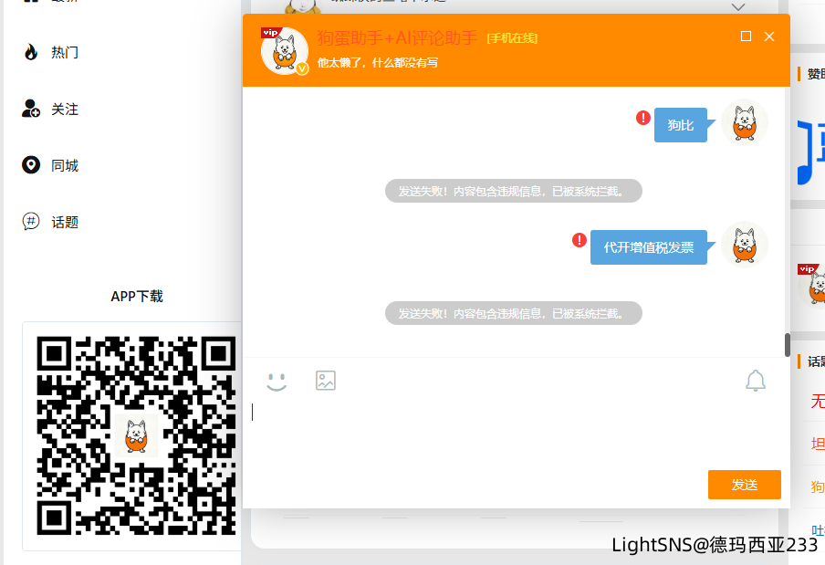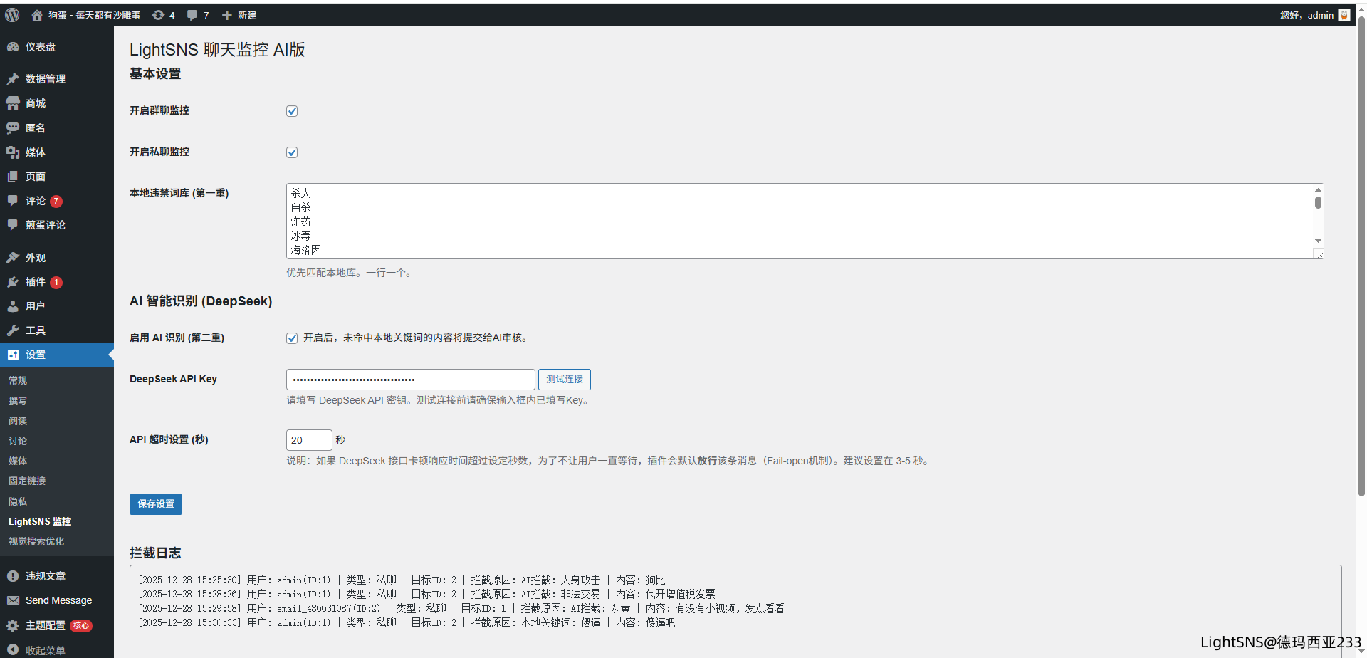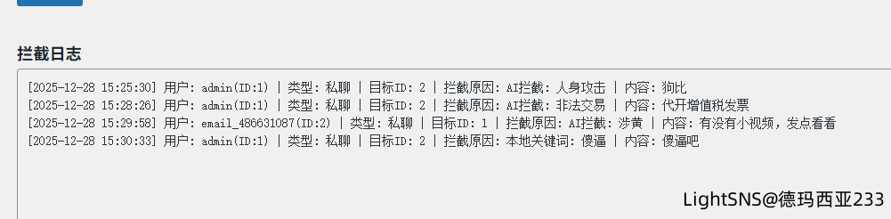 本插件专为 LightSNS 主题开发,旨在解决群聊与私聊内容的合规性监控问题。采用“本地关键词 + DeepSeek AI”双重检测机制,在确保拦截效率的同时,大幅提升对隐晦违规内容的识别能力,并保障用户流畅的聊天体验。